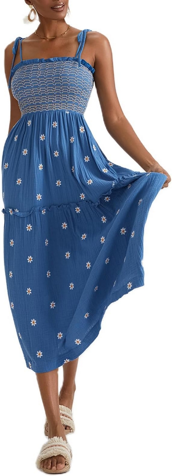 Women Floral Embroidered Maxi Dress Sleeveless Tie Shoulder Smocked Flowy Dress Summer Ideas 10