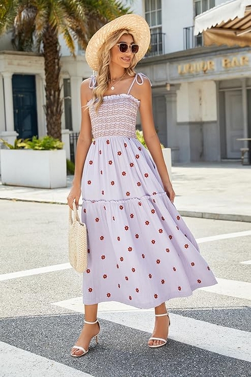 Women Floral Embroidered Maxi Dress Sleeveless Tie Shoulder Smocked Flowy Dress Summer Ideas